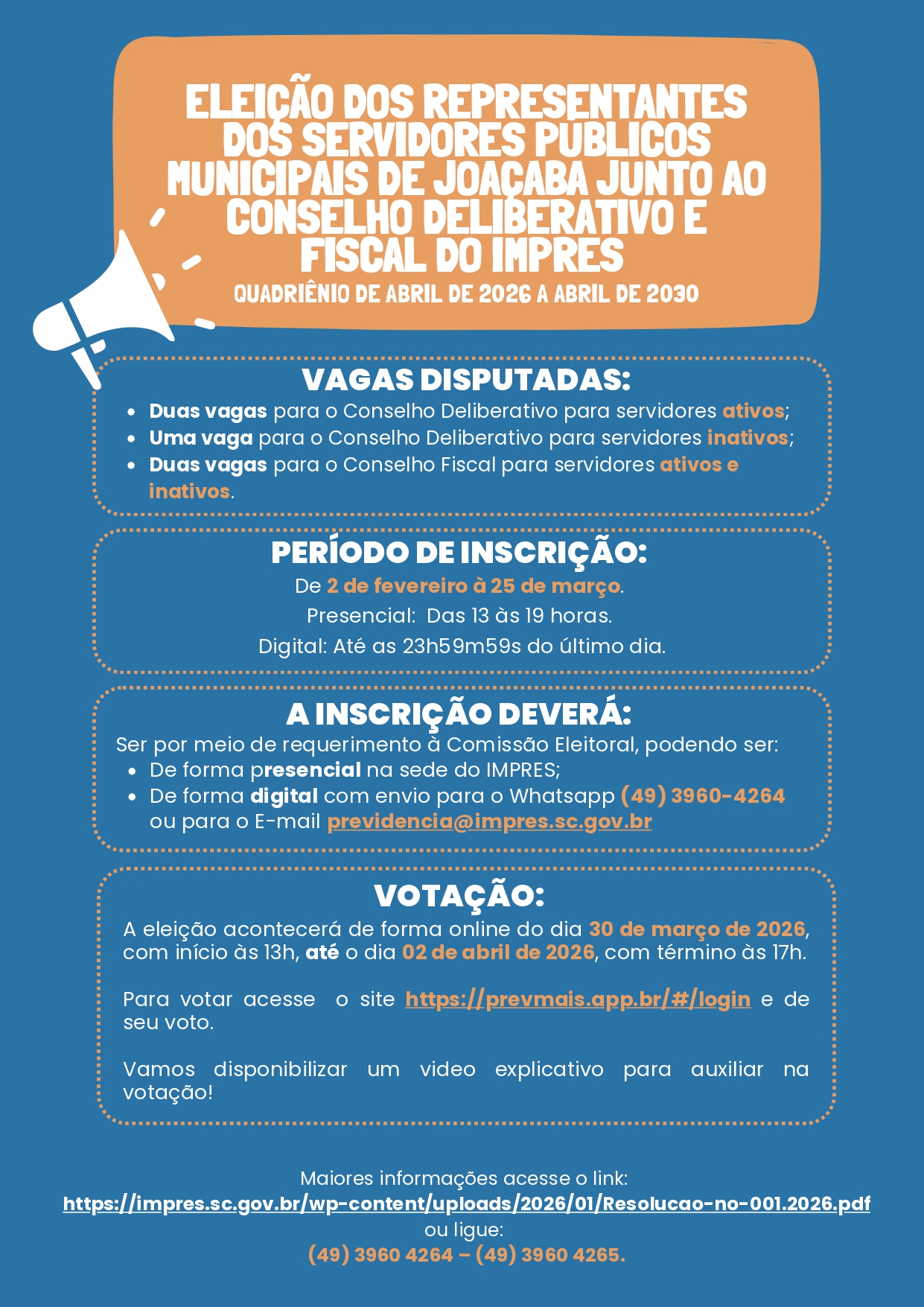 IMPRES de Joaçaba abre eleições para os Conselhos Deliberativo e Fiscal: veja como participar! O Instituto de Previdência dos Servidores Públicos do Município de Joaçaba (IMPRES) iniciou o processo de eleição dos representantes dos servidores para os Conselhos...